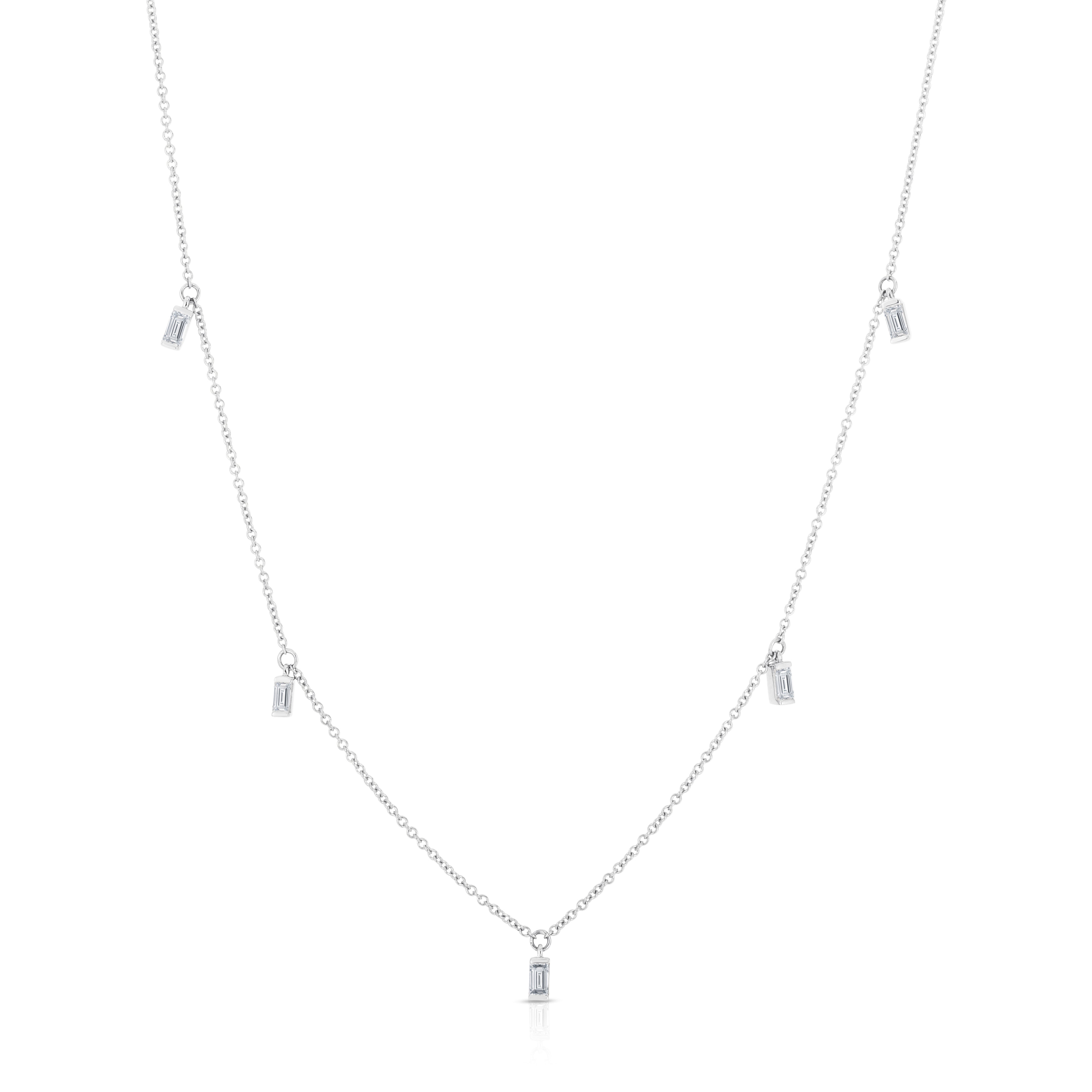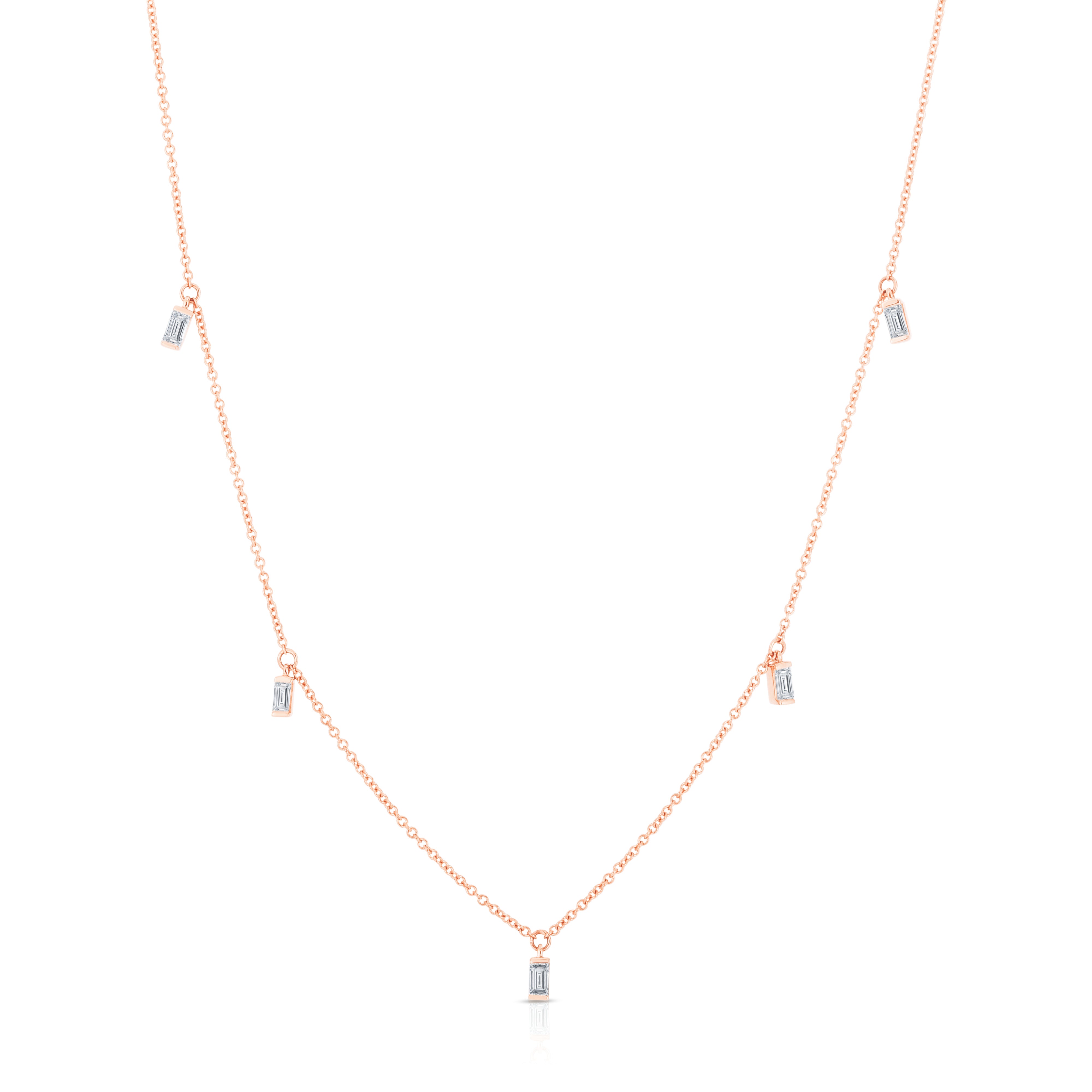 A whisper of sparkle with a wink of charm. This necklace dances with dangling baguette diamonds, like little drops of starlight that follow your every move. It's that effortlessly cool piece you throw on and instantly feel like the main character—because you are.