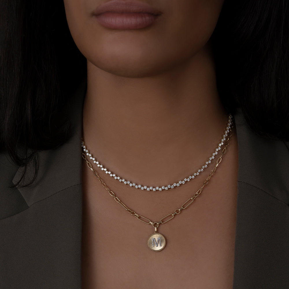 Bold links, a glimmering diamond initial, and a textured medallion that feels like it’s been plucked straight from your dream jewelry box. This necklace doesn’t just accessorize—it tells a story. Layer it, flaunt it, or make it your signature piece, because personalization never looked so fabulous.