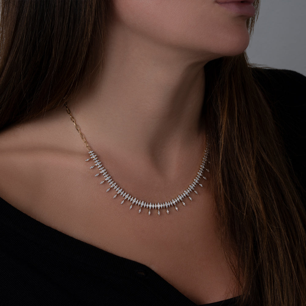 Memorable, glamorous, edgy? Yes, yes and yes. If you're looking for a necklace that reflects your best qualities, this showstopping piece has it all (and then some). Three round diamonds are flawlessly set to create each marquise-cut stone illusion. In total, over 280 diamonds bring this dazzling piece to life.