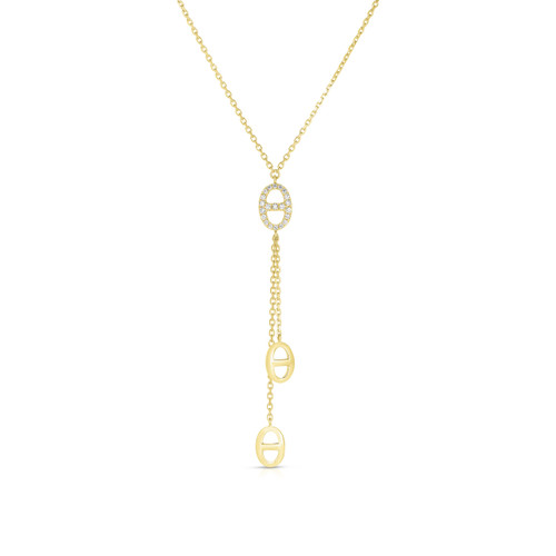 Drop a little elegance into your day. This mariner lariat necklace adds the perfect touch of modern flair with its sleek, elongated design. A pavé diamond-accented mariner link anchors the necklace, with two more polished links dangling gracefully from the chain. Crafted in 14k gold, this lariat is all about effortless style.