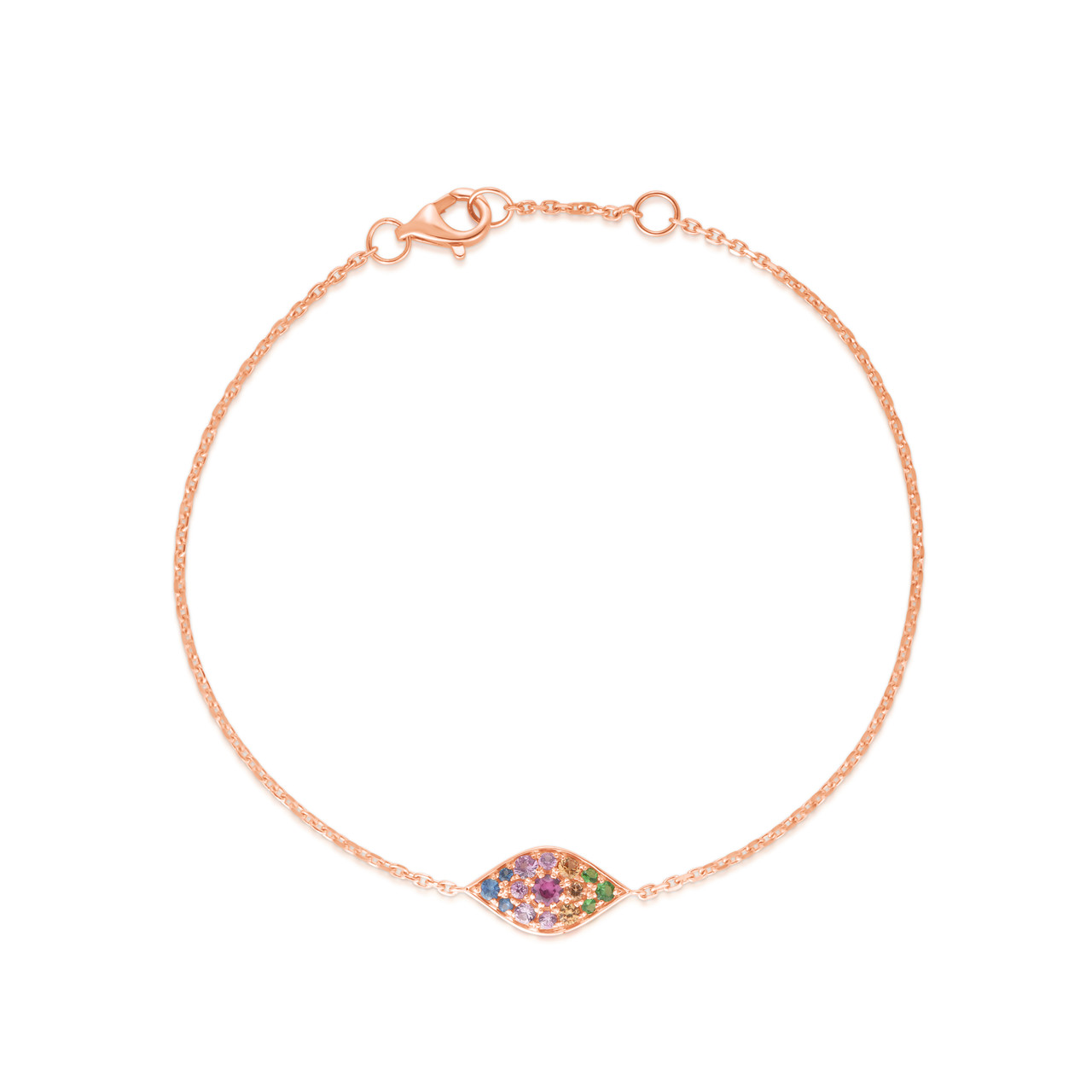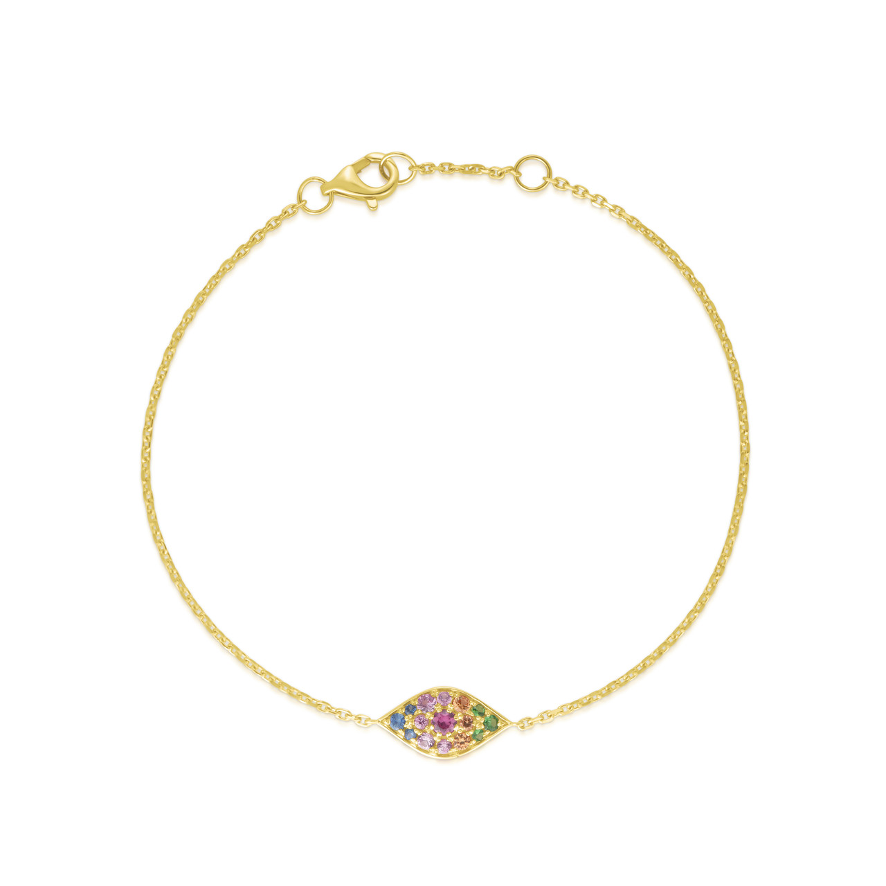 A playful twist on protection. This dainty evil eye bracelet features rainbow sapphires set in 14k gold—charming, colorful, and always watching. Wear it solo or layer it into your everyday stack.
